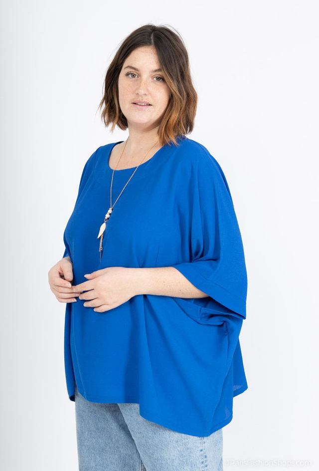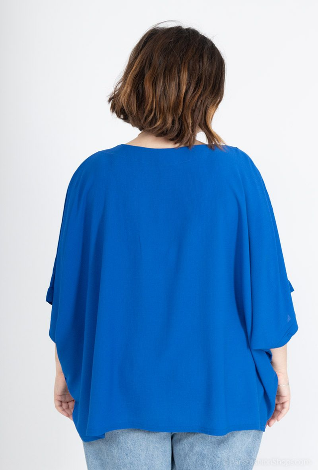 Blouse bleu roi fluide avec manches chauve souris et avec collier.