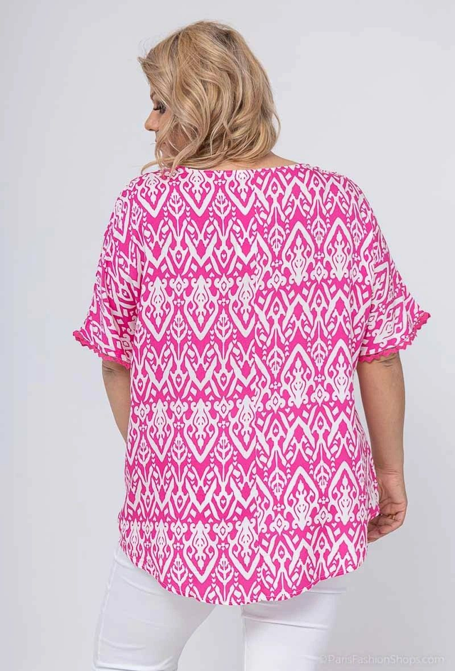 Blouse fuchsia avec col v dentelle. Longueur: 78 cm