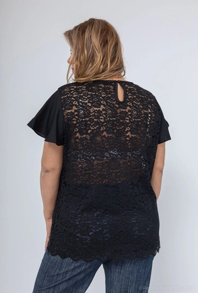 Jolie petite blouse en dentelle avec doublure sur le devant. Zip invisible sur le côté. Manches volants en crêpe.