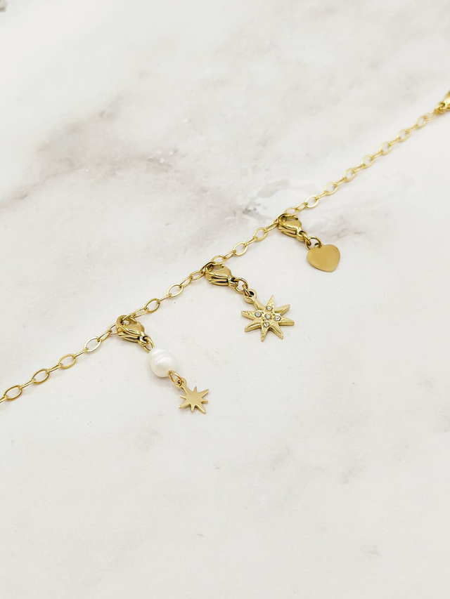 Bracelet à chaîne fine est orné de trois charms élégants : une étoile sertie de cristaux brillants, une petite perle naturelle suspendue à une étoile miniature, et un cœur doré minimaliste. Chaque charm apporte une touche symbolique et féminine à ce bijou raffiné. La combinaison de l'éclat doré et de la douceur de la perle fait de ce bracelet un accessoire à la fois moderne et intemporel. De plus, sa longueur ajustable permet de s’adapter parfaitement à différents poignets.