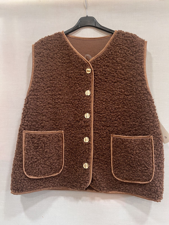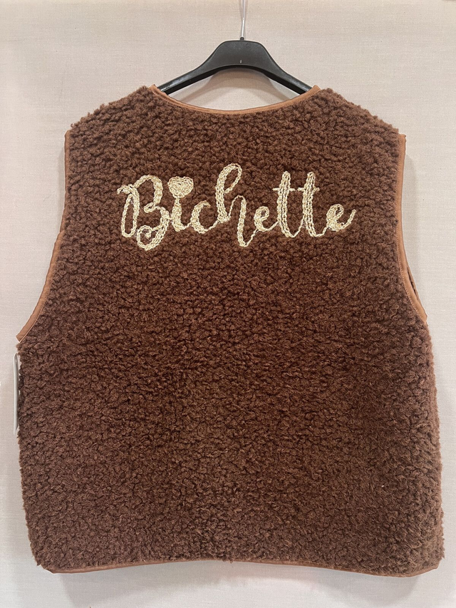 Gilet sans manches en laine bouclée avec poches frontales et broderie “Bichette” au dos.