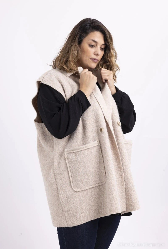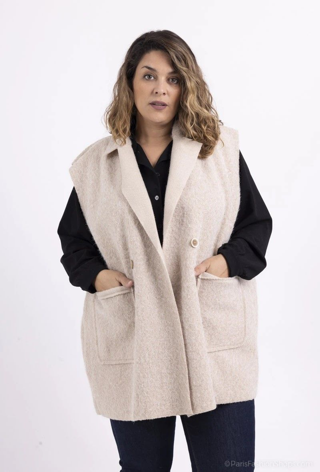Gilet sans manche col tailleur effet laine bouillie duveteuse avec 2 boutons.