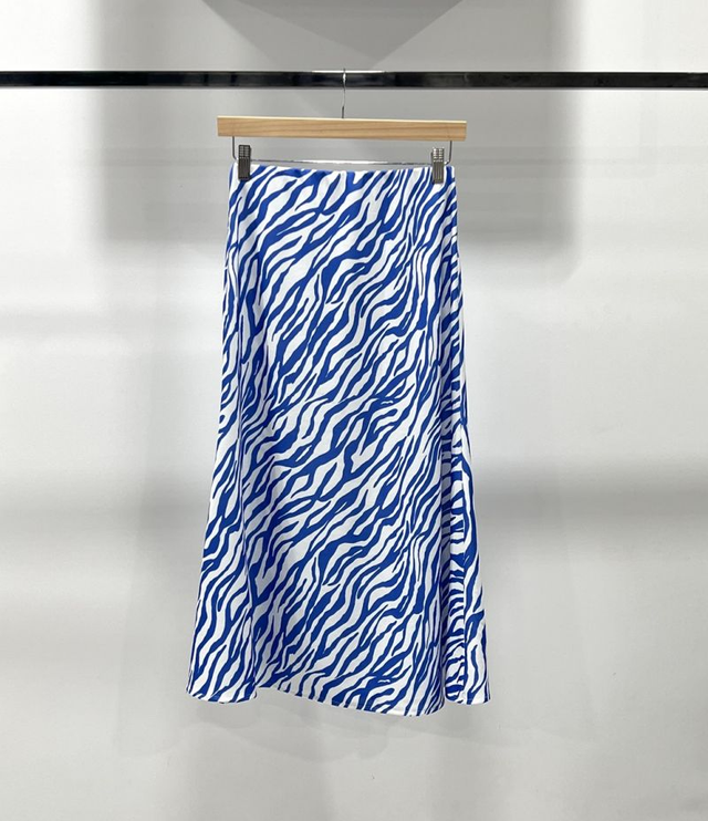 Jupe mi-longue à imprimé zèbre bleu roi.