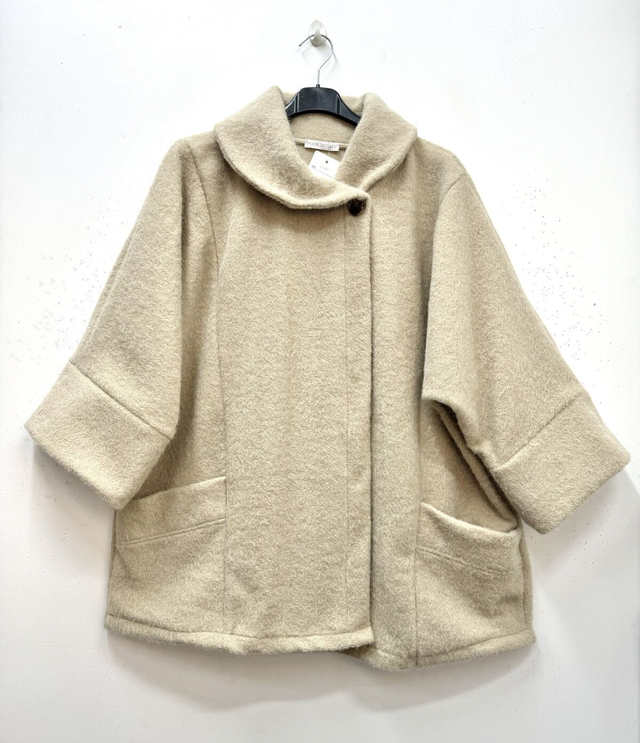 Manteau/ cape à col châle avec fermeture 1 bouton au niveau du col. Toucher laine bouillie duveteuse, avec 2 poches, pas de doublure. Manches 3/4 larges.