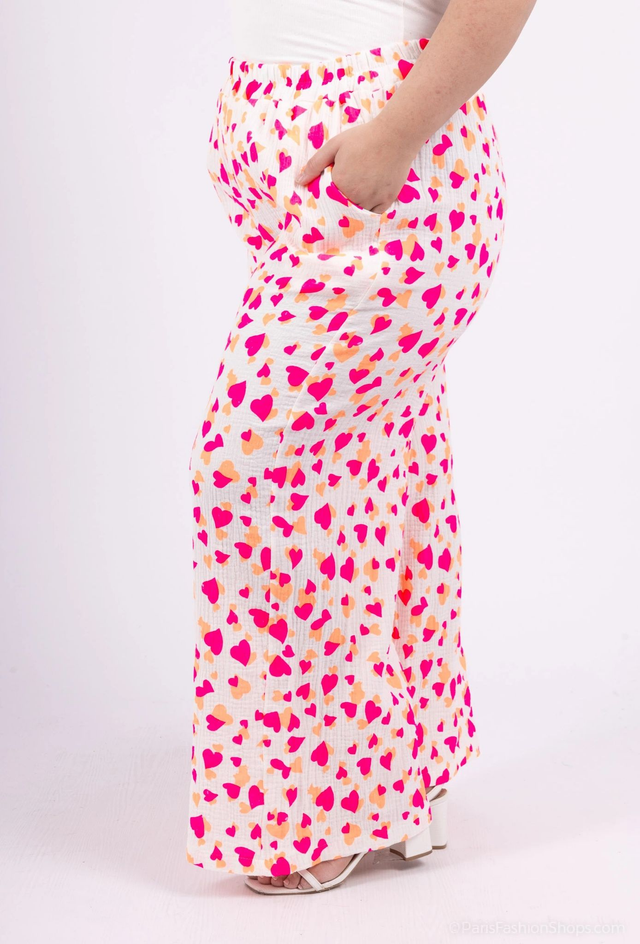 Pantalon blanc avec des cœurs fuchsia et orange en coton élastique, dotée d'une taille élastique pour un confort optimal.