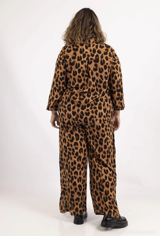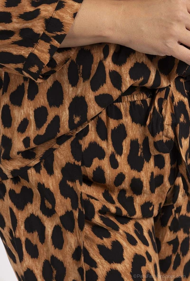 Pantalon imprimé léopard coupe large avec deux poches, élastique à la taille et fente