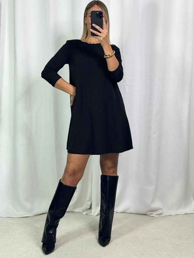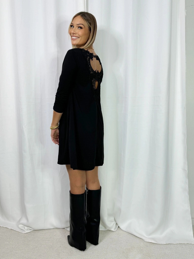 Robe noir évasée avec un détail de dentelle au dos.
