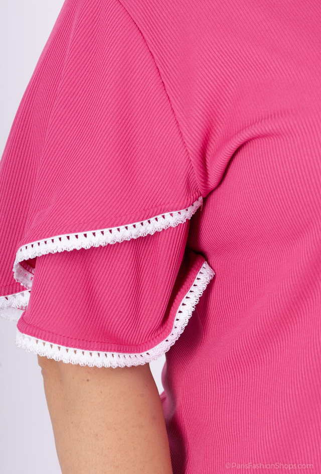 T-shirt fuchsia trou de serrure, manches évasées, dentelle élégante, idéale pour l'été.