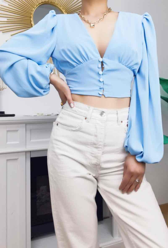Top court avec boutons bleu ciel