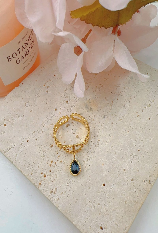 Bague doré réglable en acier inoxydable avec pierre noire.